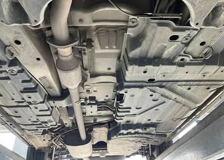 En observant la partie centrale du châssis, on constate que la carrosserie de part et d'autre du tuyau d'échappement est protégée par des plaques de protection en plastique, et que l'espace adjacent au tuyau d'échappement est réservé à l'arbre de transmission des modèles à quatre roues motrices.