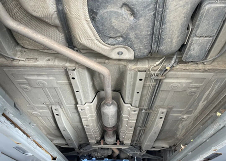 Examinons d'abord le châssis, comme le montre l'image suivante. Le dessous du moteur et de la boîte de vitesses d'origine ne comportait pas de plaques de protection, et la connexion souple du tuyau d'échappement présentait des traces de dommages dus aux rayures au sol.