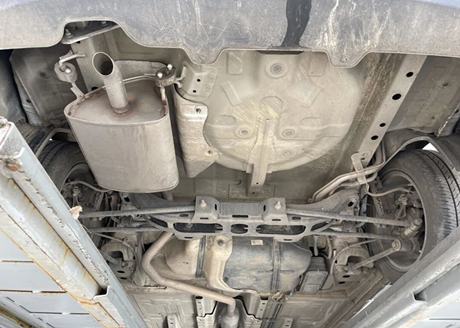 En examinant la partie centrale du châssis, on constate qu'elle présente une surface métallique sans blindage, caractéristique de la plupart des voitures américaines. Elle offre une bonne protection contre la corrosion et aucune trace de rouille n'est visible.