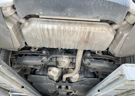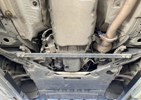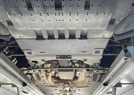 Soulevez la voiture et vérifiez l'état du châssis. Une plaque de protection en plastique est présente sous le moteur, mais elle ne protège que la moitié avant. Des plaques de protection sont présentes de chaque côté de la partie centrale de la carrosserie.