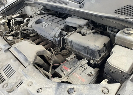 Commençons par examiner le compartiment moteur. Il s'agit d'un moteur 1AR, quatre cylindres en ligne de 2,7 litres, associé à une boîte automatique à six rapports. L'état de tous les composants du compartiment moteur est correct ; mis à part un peu de saleté, il n'y a pas de problème majeur.