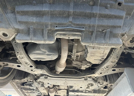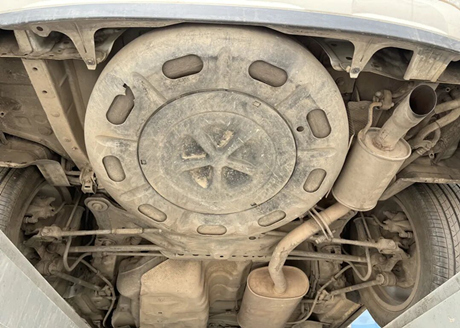 Soulevez la voiture pour examiner le châssis ; vous constaterez qu'il ne reste qu'une partie de la plaque de protection inférieure du moteur et de la boîte de vitesses. Le carter d'huile moteur se trouve à gauche, et le carter d'huile de boîte de vitesses à droite.