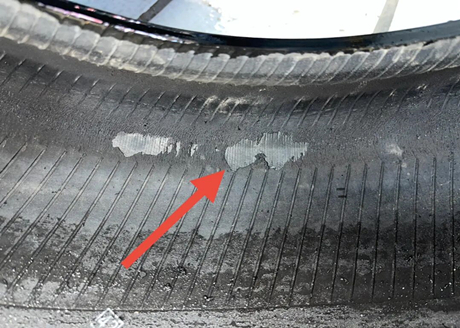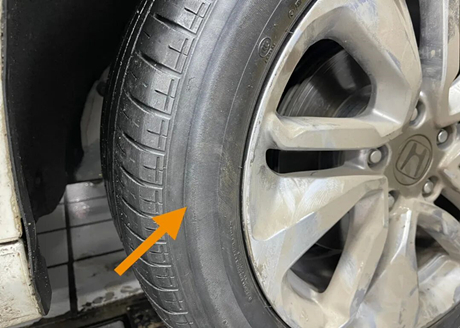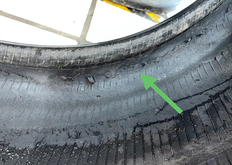En desserrant les vis du pneu, le conducteur a constaté une marque d'écrasement nette sur le flanc du pneu et a demandé au propriétaire : « Avez-vous parcouru une certaine distance avec le pneu à plat ? » La flèche indique que le flanc du pneu est déjà cabossé, ce qui est dû au fait de rouler avec un pneu complètement dégonflé.