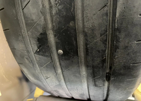 Une Tesla Model 3 est arrivée à l'atelier car le tableau de bord indiquait une pression de pneu insuffisante sur la roue arrière gauche. Après inspection, il s'est avéré qu'un clou avait crevé le pneu et un technicien a dû le démonter pour le réparer.