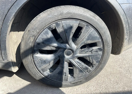 Les jantes de la Tesla Model 3 sont en fer, recouvertes d'enjoliveurs en plastique. En retirant ces enjoliveurs, on aperçoit les vis de fixation des pneus.