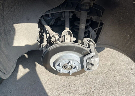 Les roues ont été rapidement démontées par le mécanicien et fixées à l'aide de cinq écrous à vis, comme illustré ci-dessous. On distingue les trois biellettes, les amortisseurs et les ressorts d'amortisseur sur la partie supérieure de la suspension arrière, ainsi que deux biellettes sur la partie inférieure. Il s'agit d'une suspension arrière indépendante à cinq bras, et le mécanicien a affirmé que sa tenue de route est la meilleure de sa catégorie.