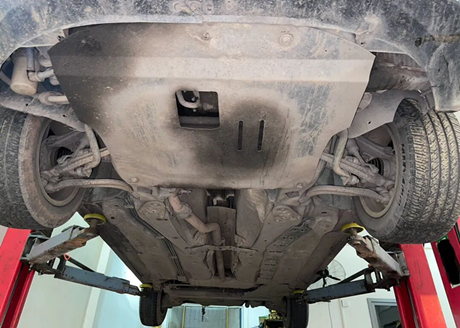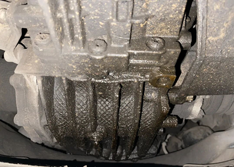 Les traces d'huile sur la plaque de protection proviennent de la boîte de vitesses, comme illustré ci-dessous. Une grande quantité de boue s'accumule au fond de la boîte de vitesses ; cette boue fuit au niveau du joint d'huile du demi-arbre.