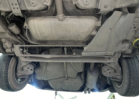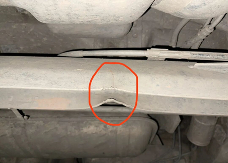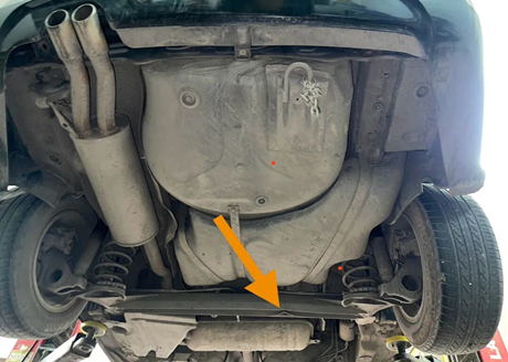 La suspension arrière est une suspension à essieu de torsion non indépendante, et le réservoir de carburant est situé à l'arrière de celle-ci. De nos jours, rares sont les voitures qui possèdent un réservoir de carburant à cet emplacement. En cas de collision arrière, le réservoir est facilement comprimé. Un problème affecte actuellement la suspension arrière, comme indiqué par la flèche sur la figure ci-dessous : elle a subi une déformation.