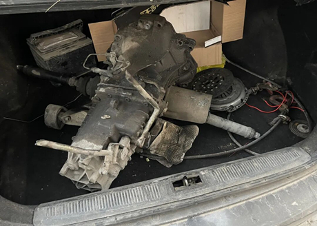 Avec l'accord du propriétaire du véhicule, le mécanicien a rapidement retrouvé la boîte de vitesses complète à la casse, comme le montre la photo ci-dessous, ainsi que deux demi-arbres endommagés, et même des plateaux et disques d'embrayage. Il a précisé que ces derniers avaient peu servi et avaient manifestement été réparés avant d'être mis au rebut.