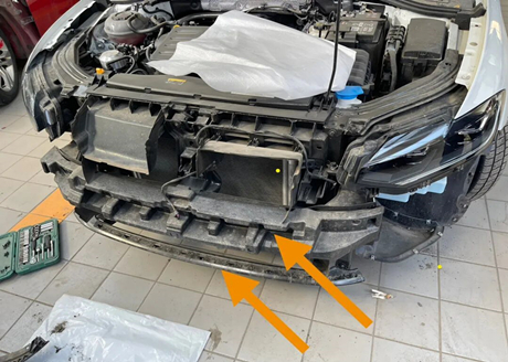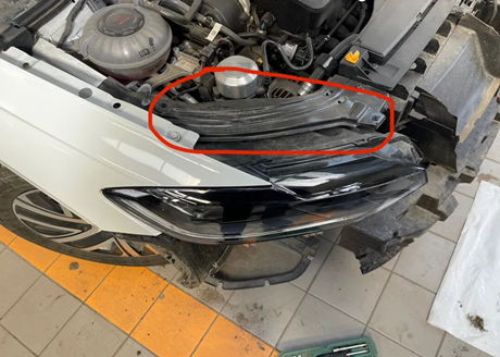 Examinons brièvement l'intérieur du pare-chocs avant de la Volkswagen Lavida. Le pare-chocs a été démonté en raison de rayures sur sa face avant et d'un endommagement de la baguette décorative inférieure. Son remplacement nécessite donc son démontage complet.